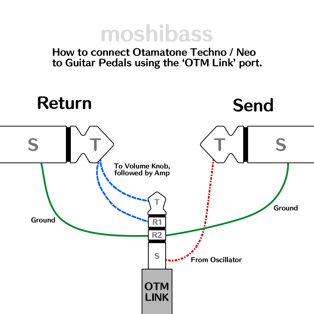 The OTM Link port is a 3.5mm TRRS jack present on the Otamatone Techno and Otamatone Neo. It is a fully analog connection, and serves as an effects loop by intercepting the Otamatone’s signal between the Oscillator and Internal Amp.
